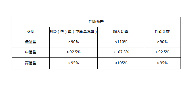 低溫型壓縮機或壓縮機組的制冷量、熱量或質量流量應大于等于90%,輸入功率小于等于110%,性能系數大于等于90%。